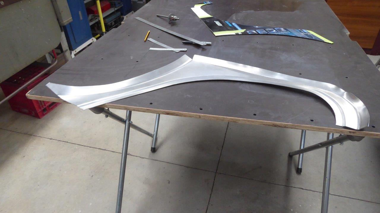 The next part of the inner skin I am going to make is what joins the B and C pillars together along the bottom. I had to work out the exact shape that the rear guard/fender will be and its position in the wheel well. Otherwise the wheel will not be centered in the opening once completed. Also how high the door sill is going to be off the top of the chassis rail as that determined the thickness of it later on. Once that was all worked out I made a template and then added the width of the flanges that will be added onto later on.