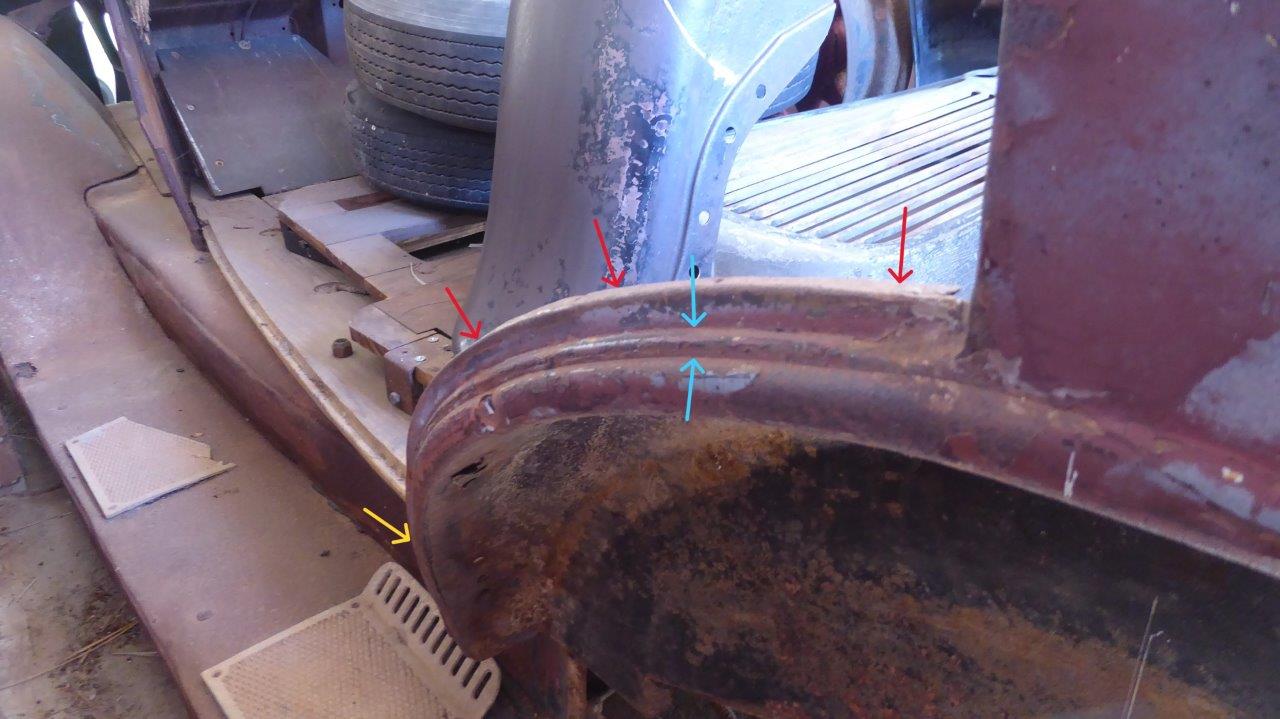 The red arrows are again showing where the new wheel arch flange is and between the blue arrows the step I want to remove. The yellow arrow shows just how complex the shape is as it bends inwards towards the door sill as well as arcing back following the body curve.