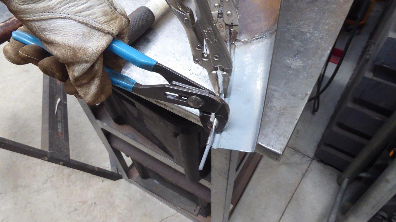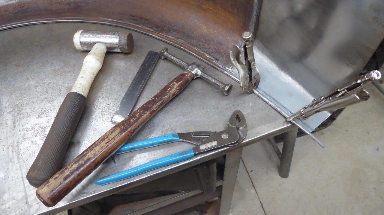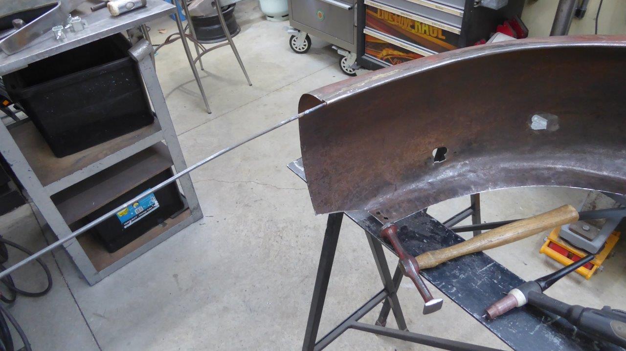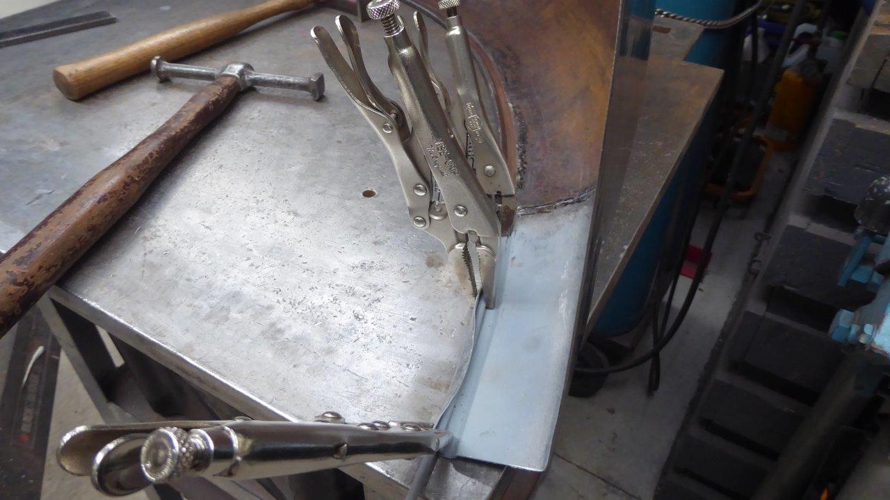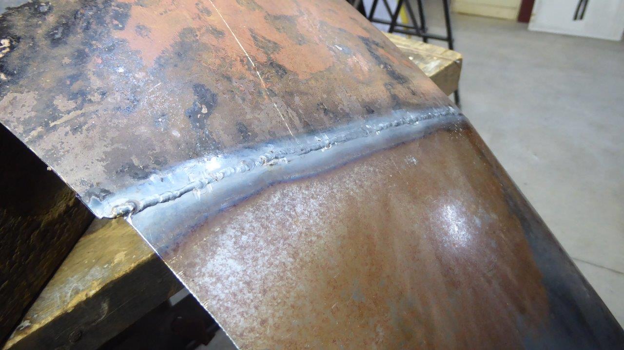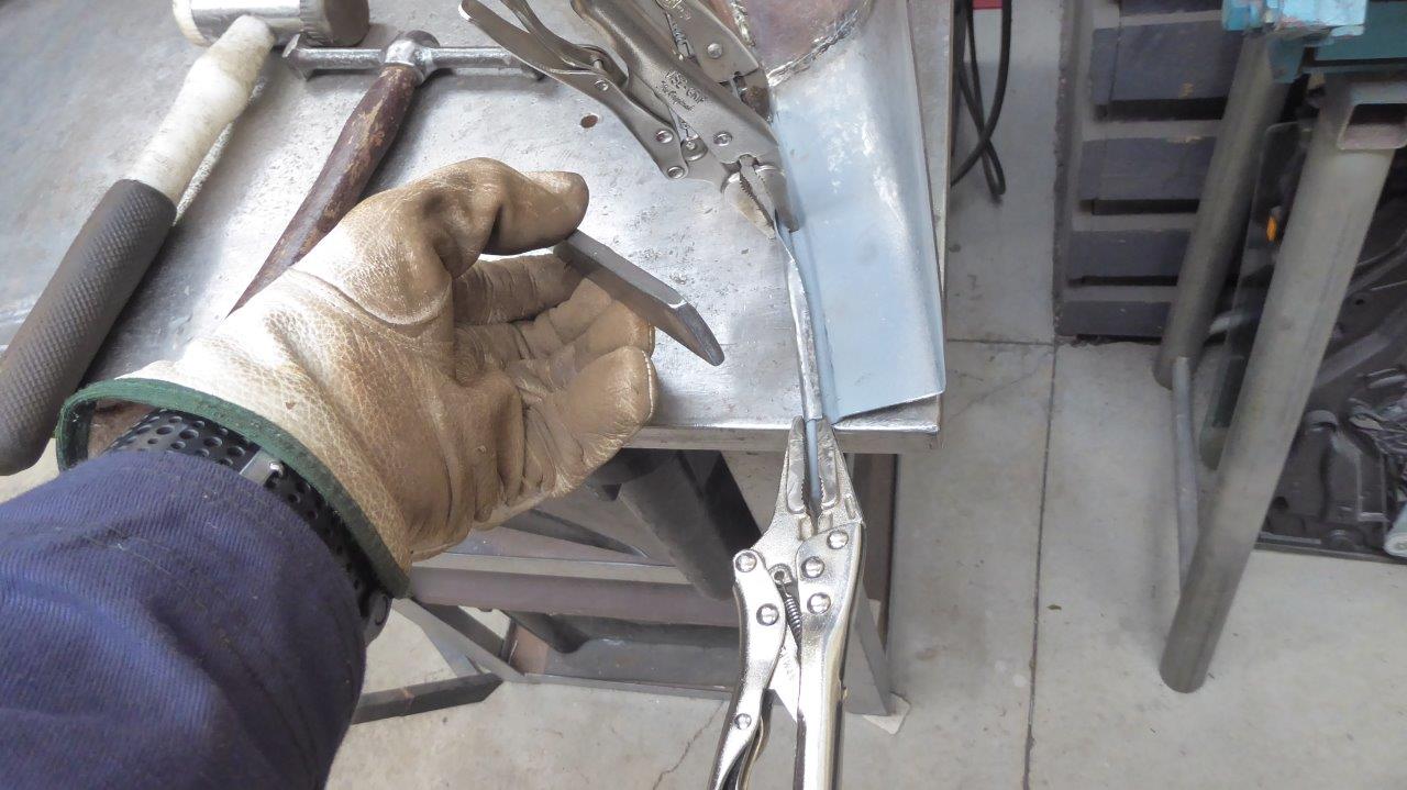 I first grind the backside of the weld flush. Then I can place a dolly directly on the ground weld seam while I hammer the front side bead to stretch the shrinking that happens with the welding. Any low spots on the backside can have the weld bead from the front side pushed into it.