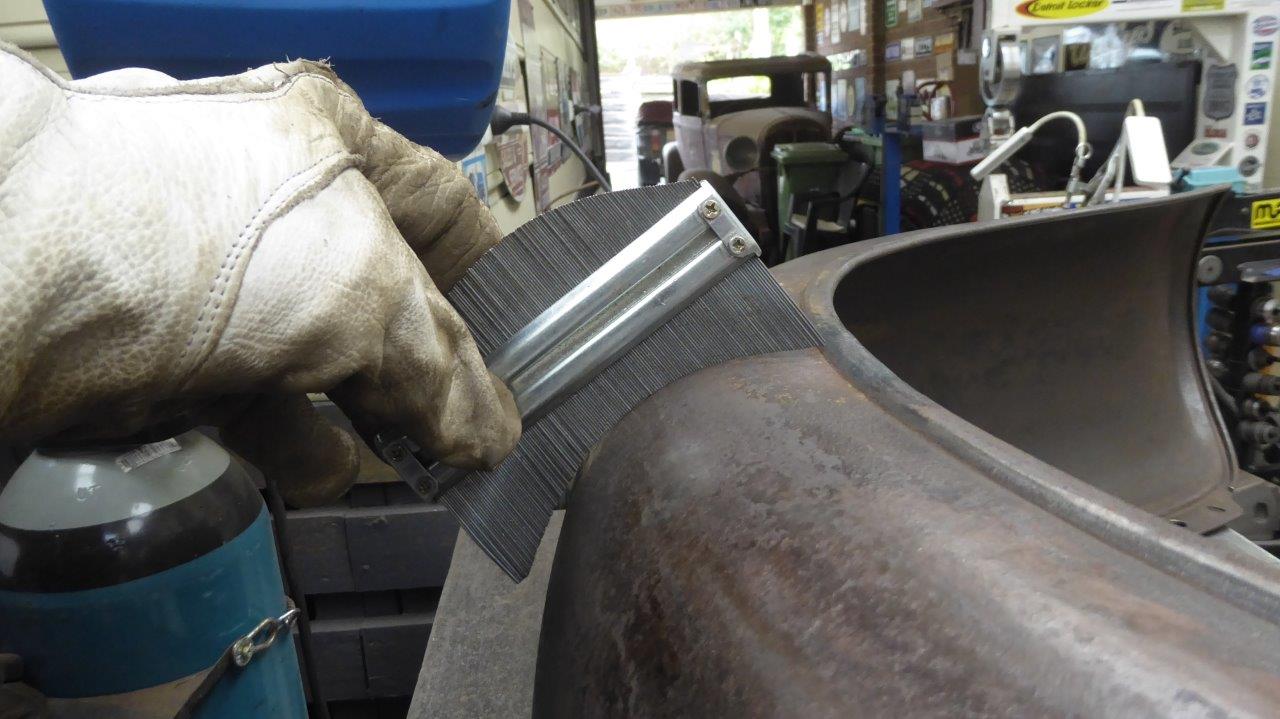 I took a contour reading from the less damaged guard from the other side at the top centre. Placing the gauge at the same spot on this one showed the difference between them. If you rock the gauge back it would show how the front face is more vertical than the other side. Remember that this side was stretched out 50mm-2" more than that side too and was really hard to get into place in the wheel arch. I have already brought that back so it matches once installed, but could do with more in the relaxed state.