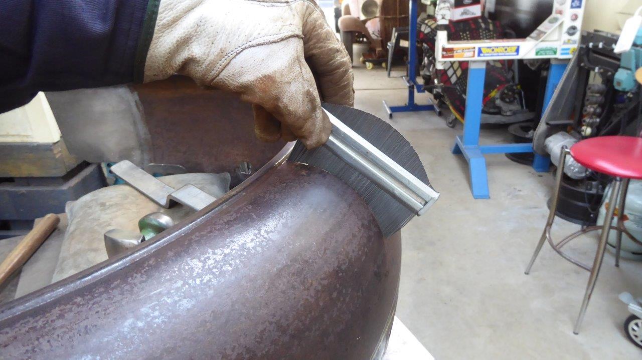 I have actually started to keep this contour right around the edge as it showed it was tightening up the arch radius when doing so. The light line shows some more still needs to be done toward the right side in the picture, so back in the English Wheel it goes.
