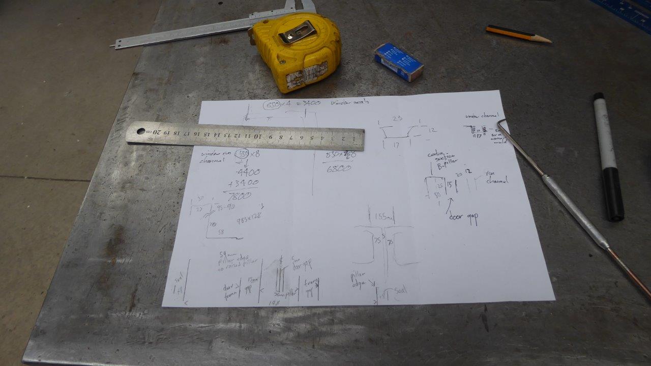 So much working out, so little to show! This is some of the notes made while working out just the B pillar. I had to see if everything would fit in the width I had between the front and rear door window frames. So that is from one window opening edge to the other one on the second door. Remembering that the rear door is suicide which places both door locks on this pillar. I added the two window frame widths, plus the door gap and then had to work out what had to fit within that space.