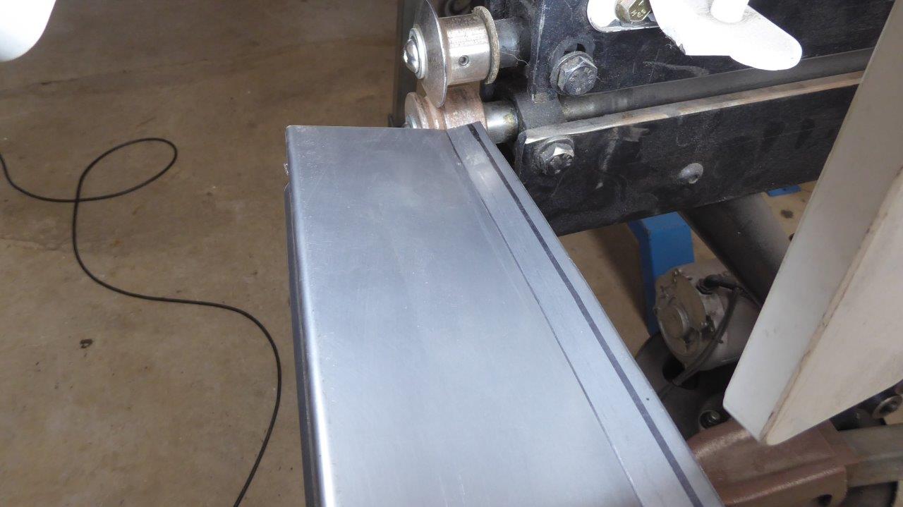 The black line is from the body template and represents the outside of the body. I then had to deduct the thickness of the door frame flange and twice the door skin thickness after it folds around it. Then also know what type of outer door seal I going to use between the inside of the door flange and the B pillar and how much the chosen seal needs to compress. The template was then moved in that total amount, plus the thickness of the B pillar itself, as the line is on the inside of the fold. As this fold is curved to match the body profile, it cannot be folded in a straight line, so the tipping wheel on the bead roller was used. First pass with the V groove under it to help start the fold. Then more passes with the bottom die turned around so you don't get a V shaped groove rather than a single fold line. The metal is pulled up while feeding it through the roller to make it bend.