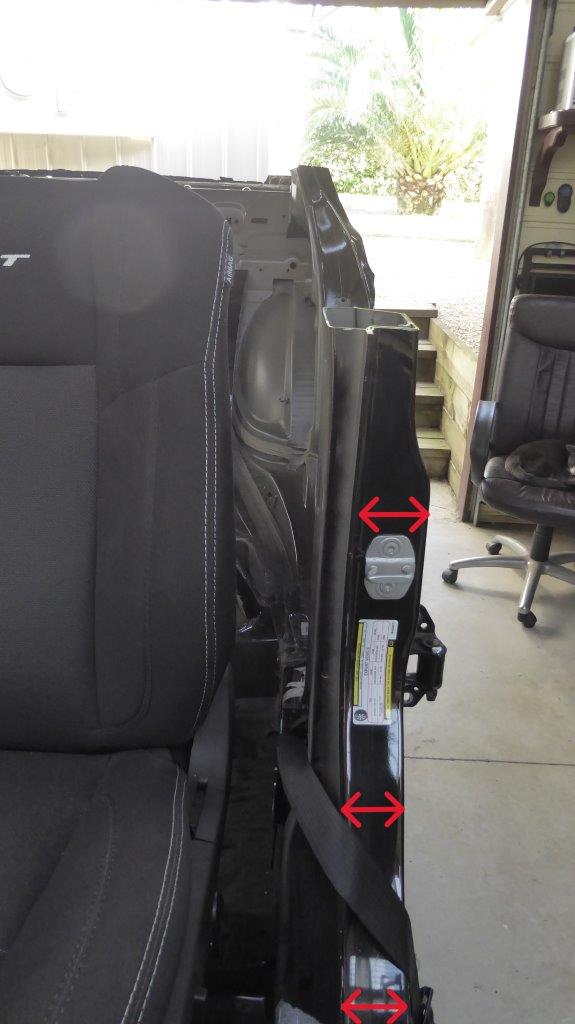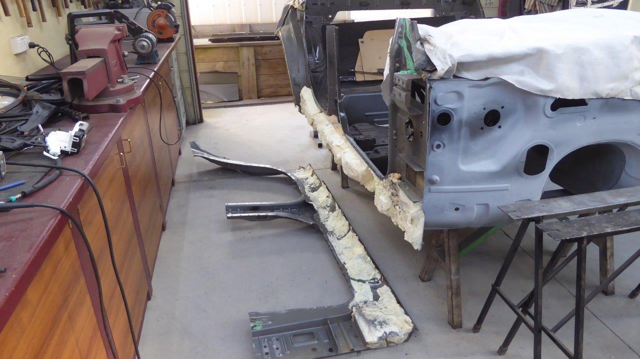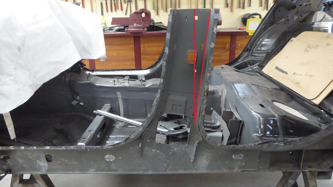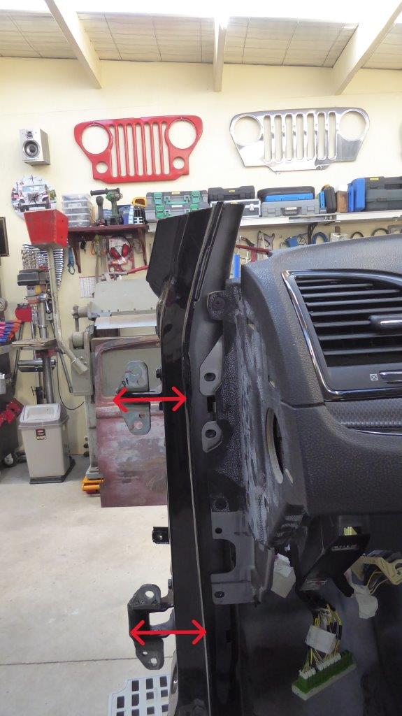 Having determined that the doors can be closer inwards once narrowed, the outer part of the body has to come off. The arrows show how much is going to be removed from the pinch weld outwards. Also on the A pillar just how far the donor doors metal inner frame sticks out from the side of the pinch weld.