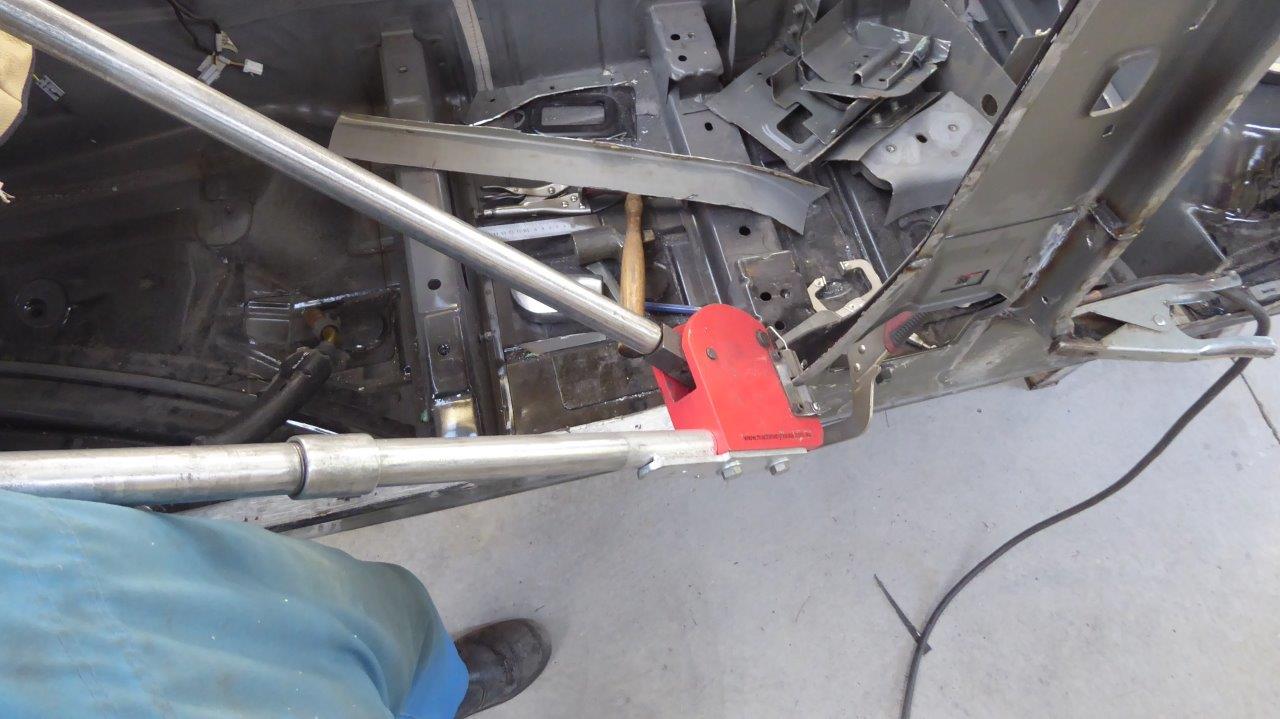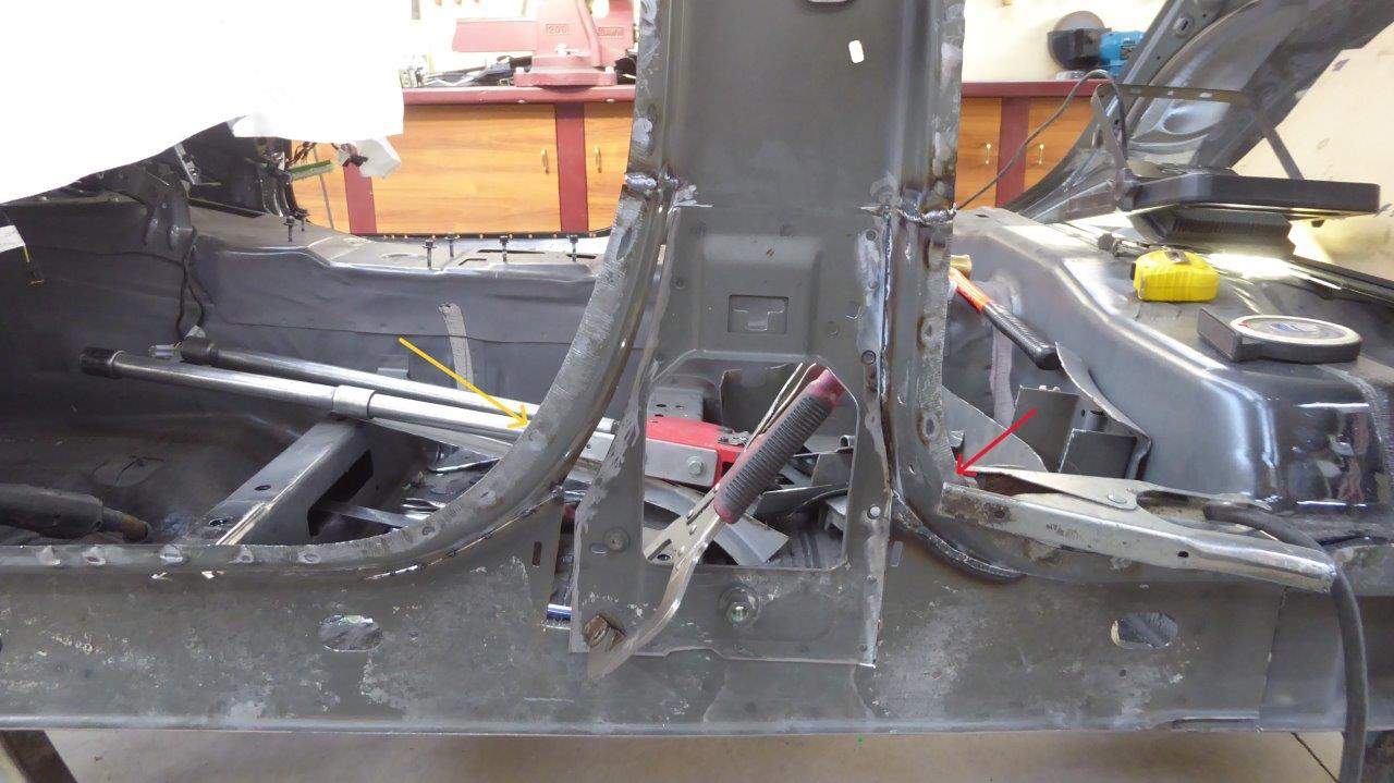 I cut straight through the pillar each side of the reel mount and down around the curved section. Then I used a potable stretcher on the back of the B pillar curved section, red arrow, and a shrinker on the forward curved section, yellow arrow, to rotate the pillar forward. You can see the gap in front of the lower reel mount of how much it had to move.