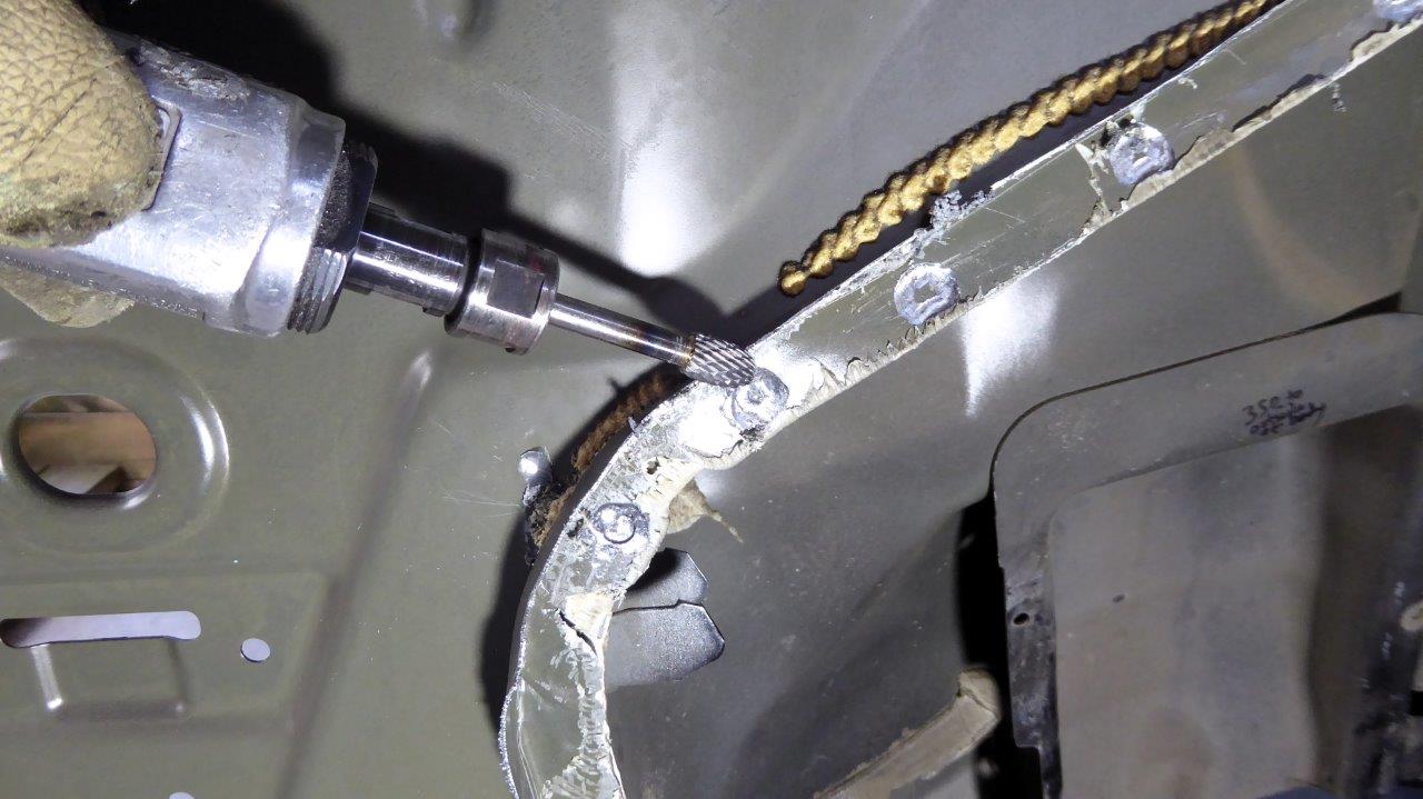 Seeing I have so many spot welds to do I have been trying different ways to remove them. I didn't want holes left after removing what is left of the inner structure flange around the rear wheel arch area, so drilling right through with a cobalt drill bit was out. I often use a centre point drill, or recently, a spot weld cutter that is like a mini hole saw when I want to preserve the metal underneath. This time I tried my die grinder with a rotary burr of the shape shown. I just ran around the edge of the spot weld to just below the thickness of the spot weld centre. Not even all the way through the thickness of the flange.