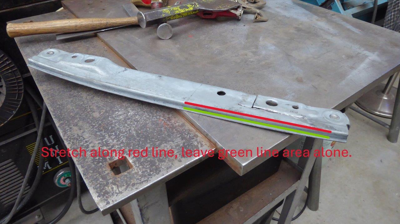 Starting at one end first to see how it goes, I cut the side out of the mounting pad so that could be flattened. Just squashing it flat with the side in place would cause it to distort sideways. To remove the curve in the guide rails, we need to stretch the bottom half of the vertical flange as pictured. The green area should be left alone.