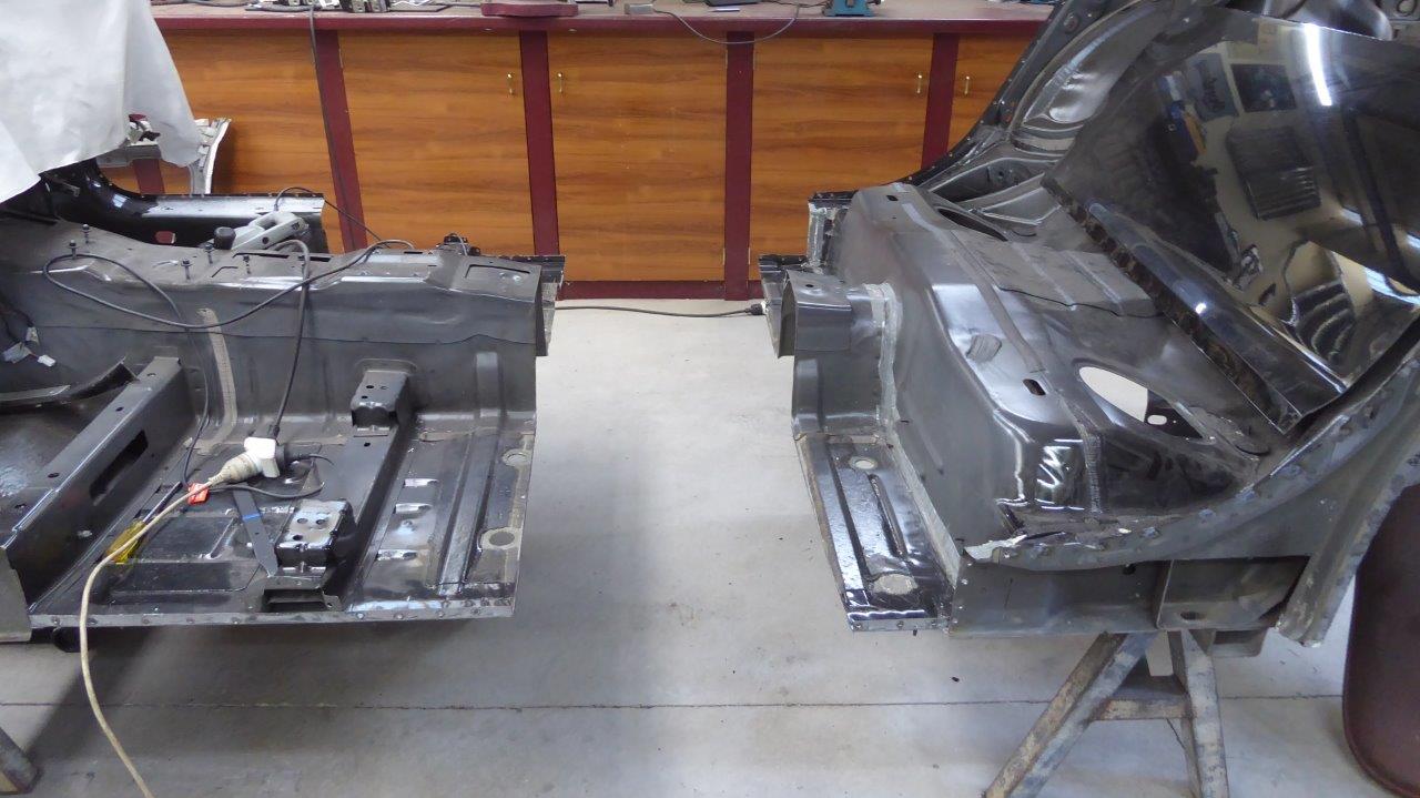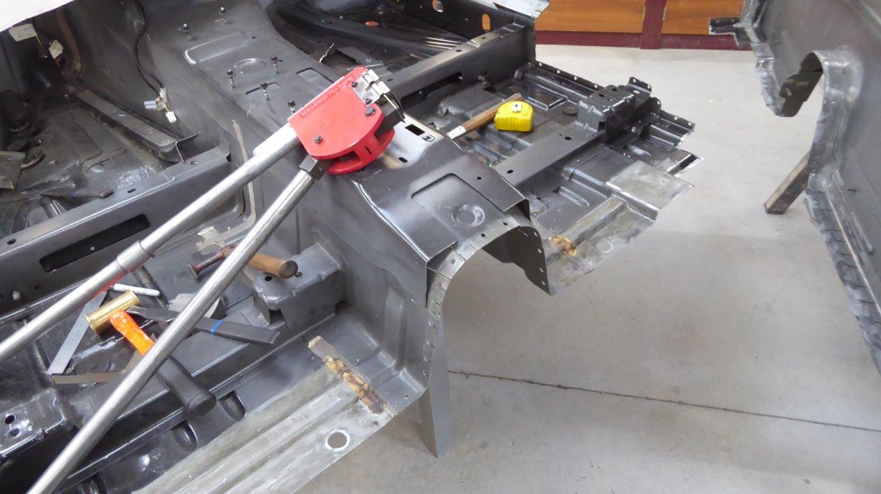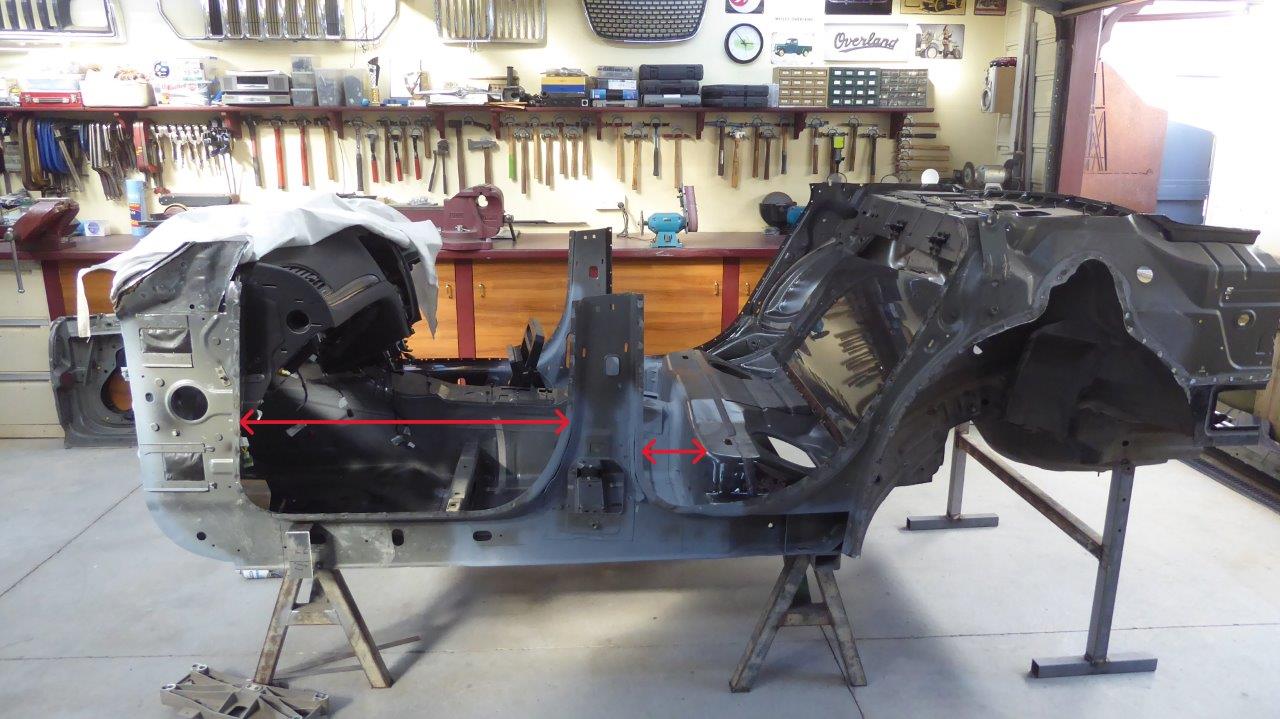 4 reference points were measured at floor level as well as from the top of the A pillars across to the top of the C pillars, both sides, before the cutting took place. Then exactly 165mm-6.5" were deducted from these to make sure everything was true and square when it came back together. By having upper and lower points of reference, it makes sure the shell is not bending in the middle. Having the rear and front halves supported at four points also stopped this from happening. Even after welding everything back together, they were all to the millimetre. The B pillar was then welded back in 70mm-2.75" further forward and the part behind the B pillar was step flanged at the factory seam after 95mm-3.75" was removed.