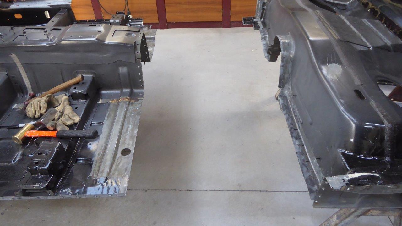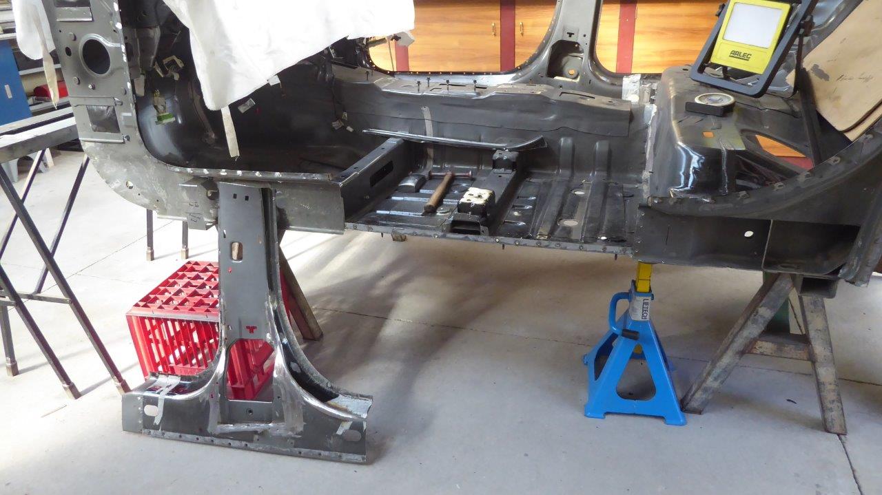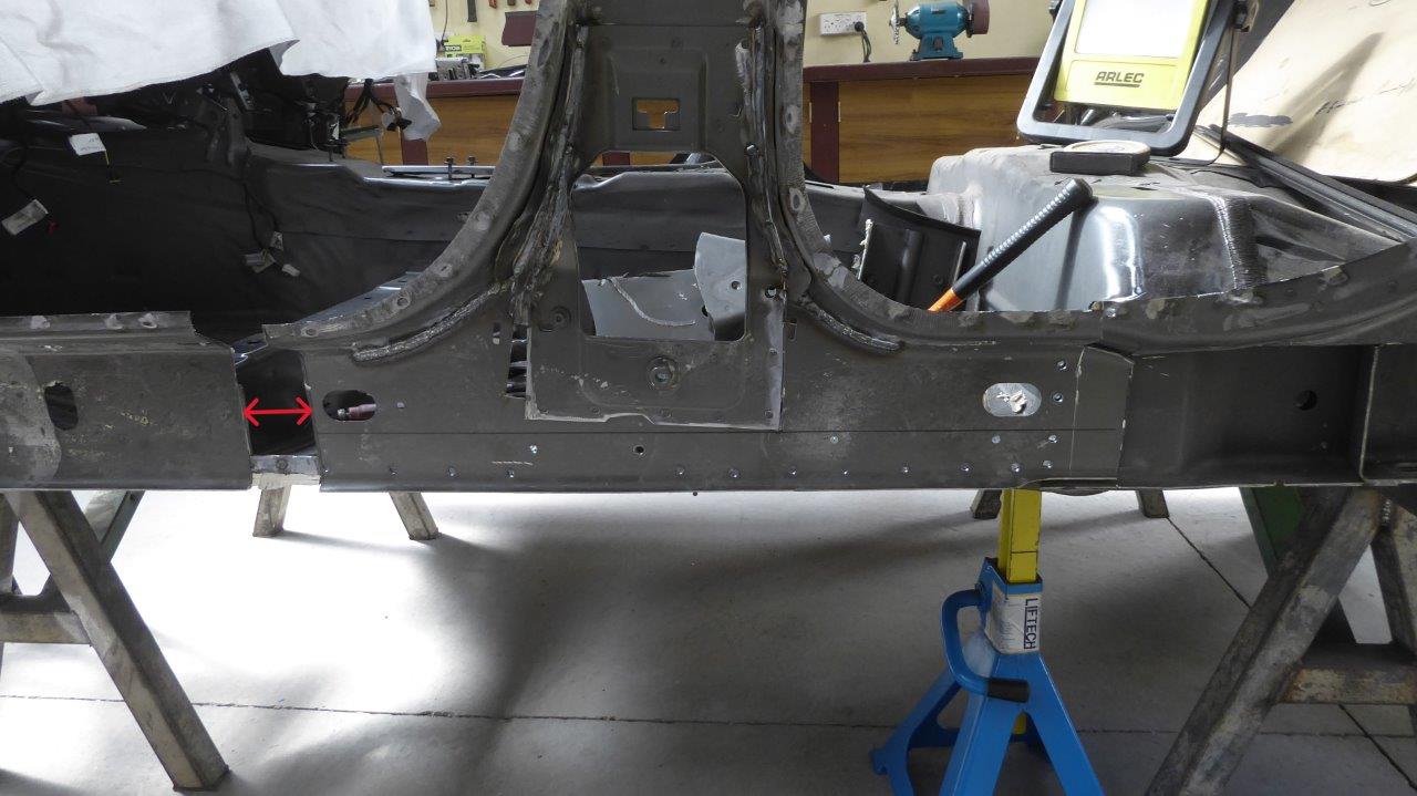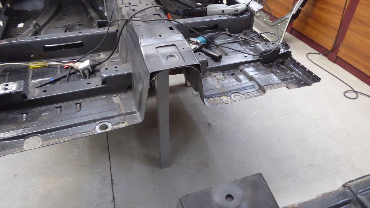 4 reference points were measured at floor level as well as from the top of the A pillars across to the top of the C pillars, both sides, before the cutting took place. Then exactly 165mm-6.5" were deducted from these to make sure everything was true and square when it came back together. By having upper and lower points of reference, it makes sure the shell is not bending in the middle. Having the rear and front halves supported at four points also stopped this from happening. Even after welding everything back together, they were all to the millimetre. The B pillar was then welded back in 70mm-2.75" further forward and the part behind the B pillar was step flanged at the factory seam after 95mm-3.75" was removed.