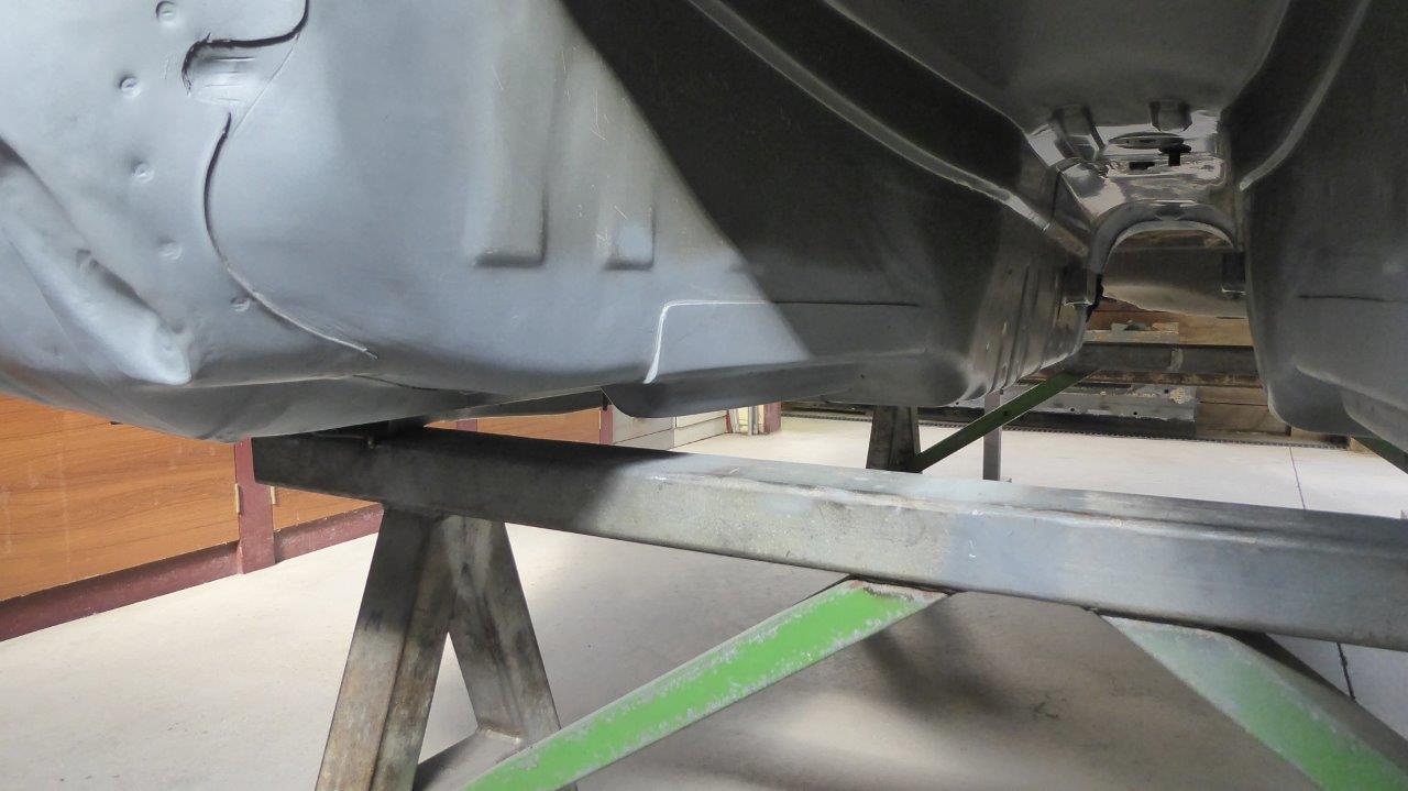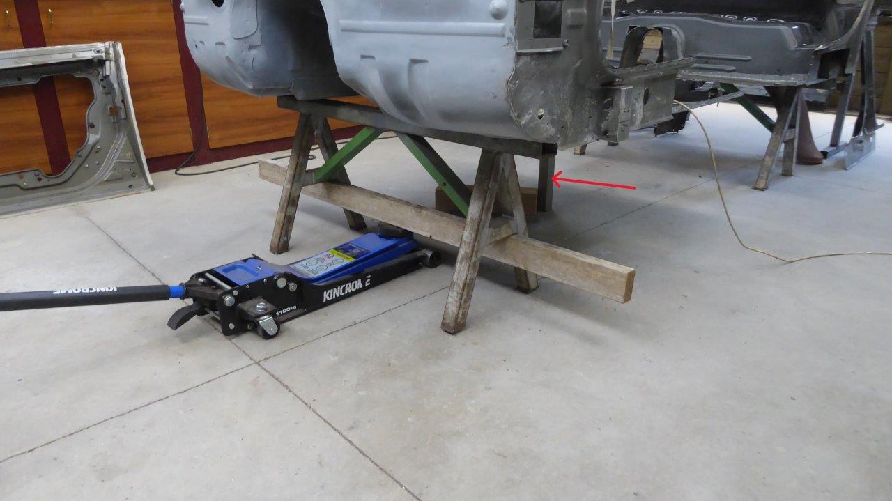 Before I cut it in two I made a support leg that bolted to the centre bearing mount inside the tunnel. It was at the exact height so alignment later would be easy and wouldn't fall after cutting the shell in two. The jack is at the balance point of the front section to make it easy to move the section around by myself.