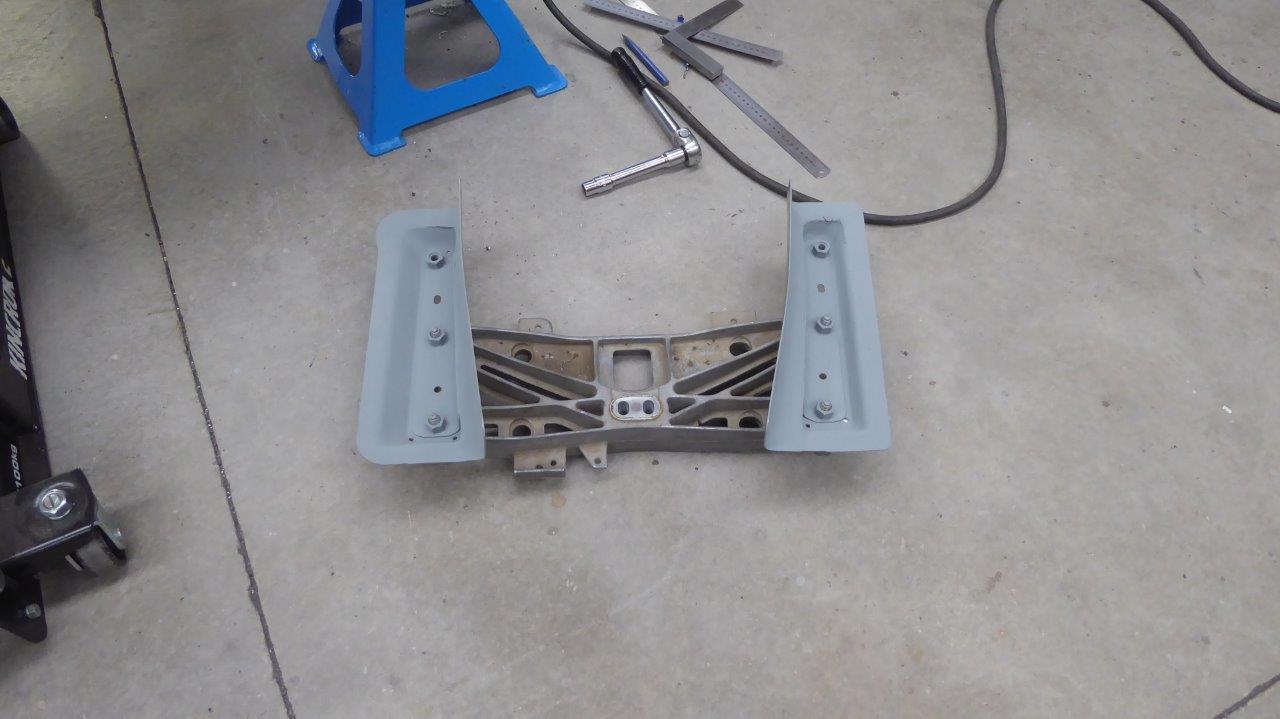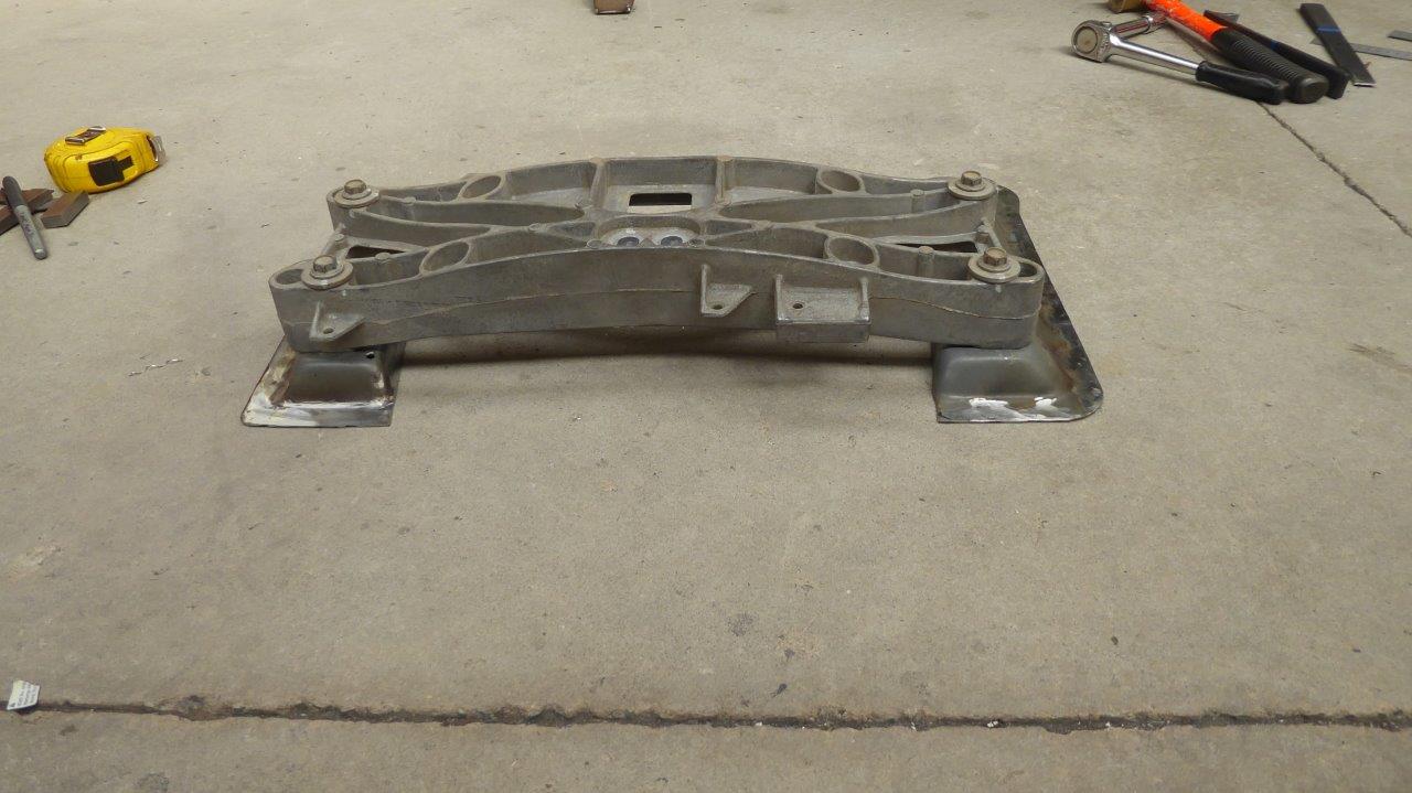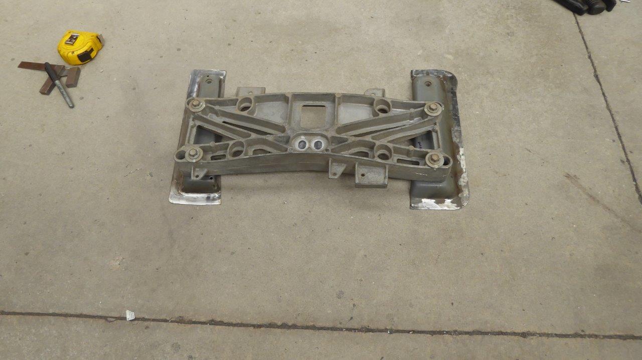 I cut the vertical parts of the mounts off and bolted it to the cast alloy transmission mount. It is actually made for either the 4 or 5 speed transmission options. The models of the transmission is cast into the piece with an arrow pointing which way to the front. You just turned it around and used the other set of bolt holes between the two models.