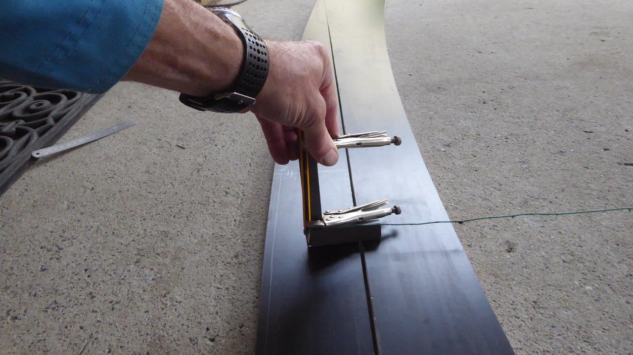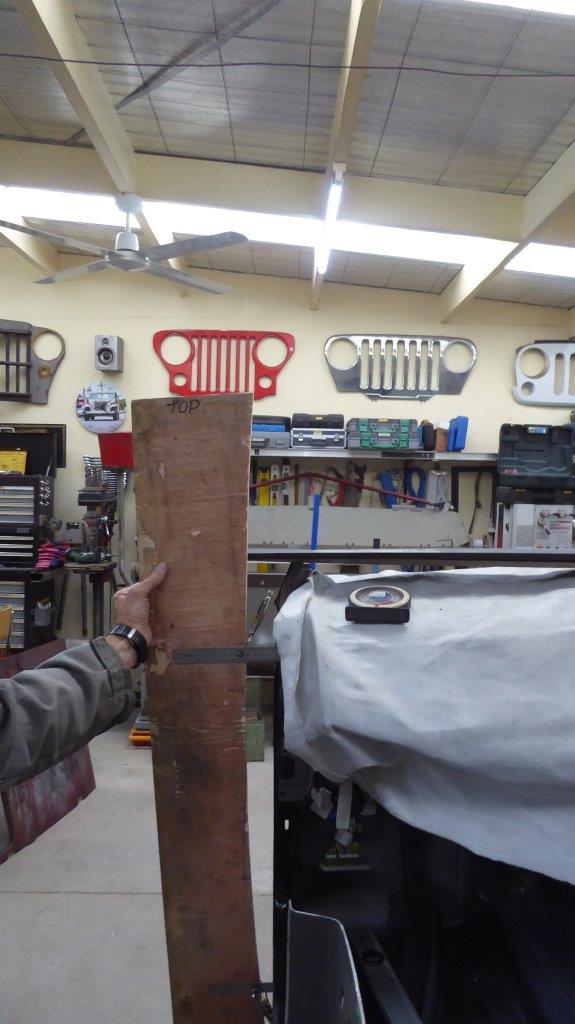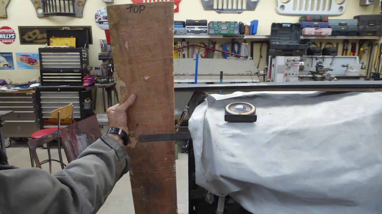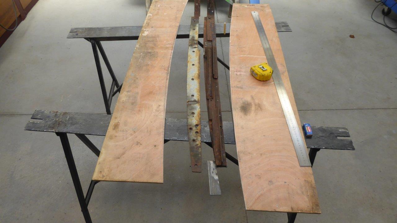 Next thing I wanted to check was the sweep, radius or curvature of the body horizontally. To know what I have stock, I raised the doors up in the middle until a metal ruler would lay of the two doors without a gap in the middle underneath it. This is to make sure I don't end up with a 'double hump' when looking down the side of the car. I lot of cars have this straight from the factory in the early days until maybe the 70's? Now I could place my large 1220mm-4' profile gauge on them and transfer it to some left over ply from the truck bed floor.