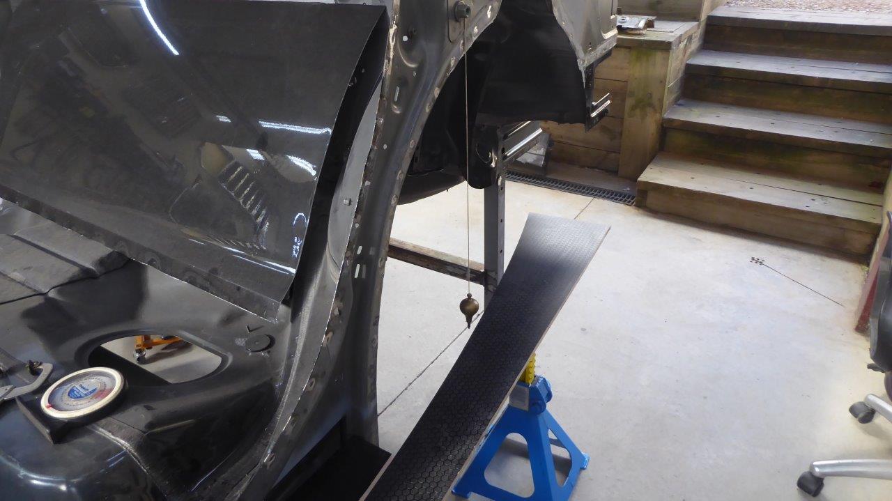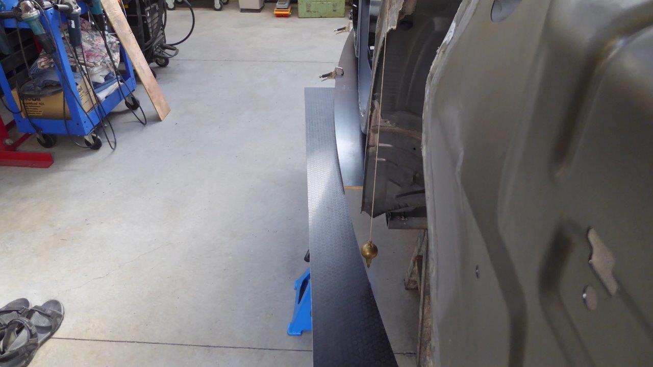 The plumb bob, beautiful old one brass from my late father, shows the minimum I must clear to leave enough structure around the seat belt reel mount. Really need even more than this as want to keep the rear parcel shelf structure intact too. The end of the template also shows that the body tucks in way too early, taking out most of the rear of wheel arch.