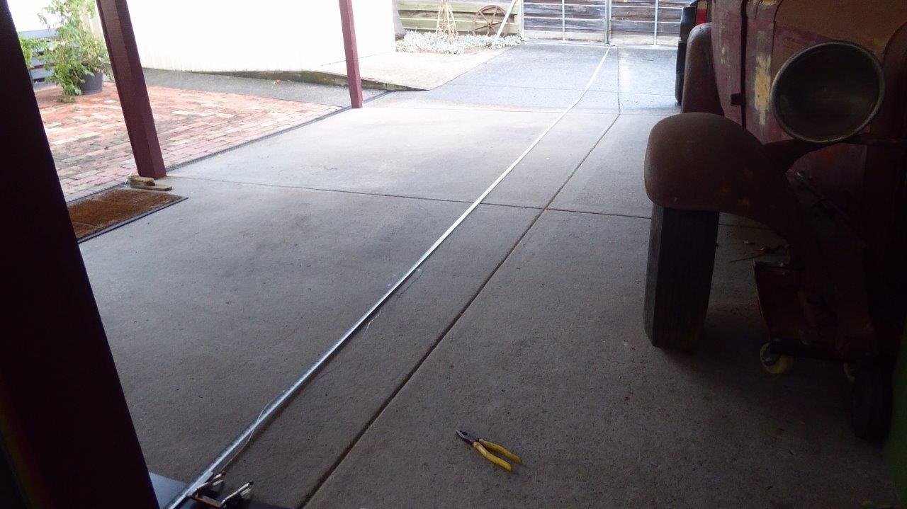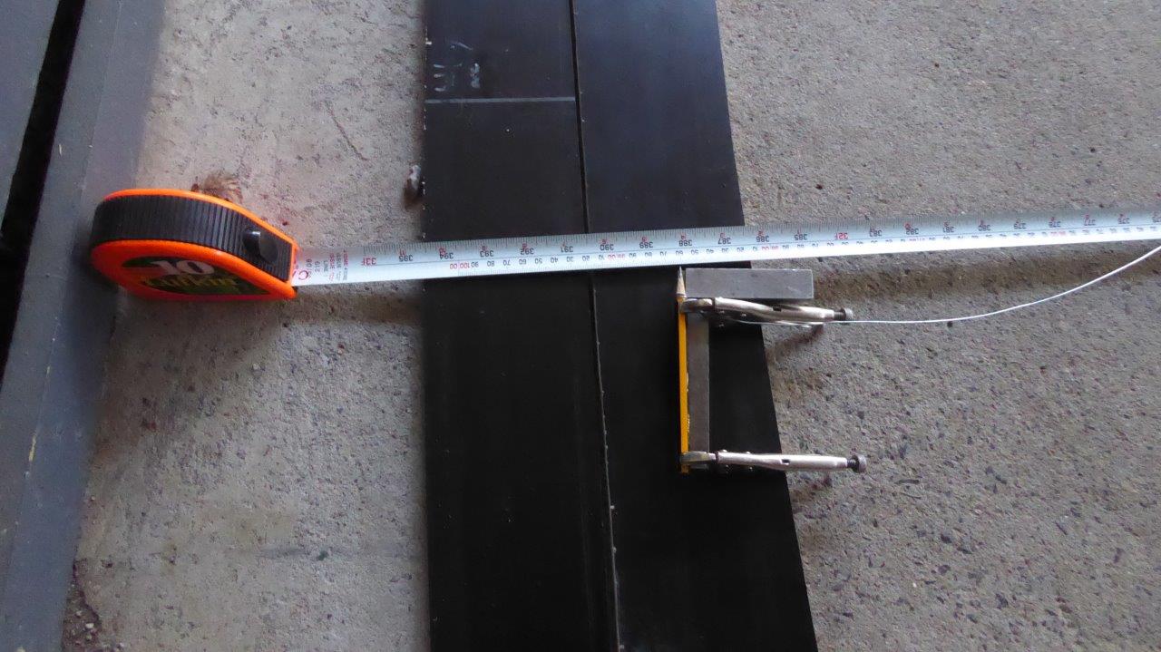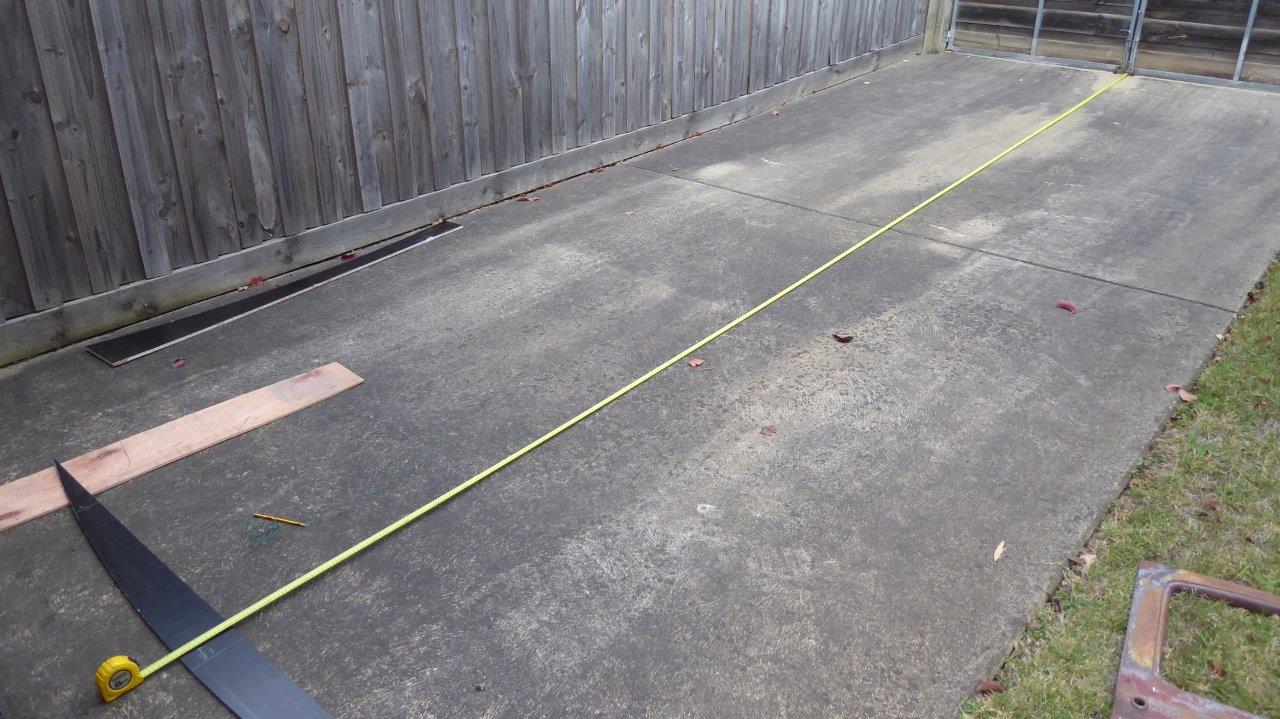 It took most of my garage driveway to get a pivot point far enough away to use. The end of the wire loops around the gate drop bolt and the pencil at the other end. The wire was kept taught while keeping the pencil as vertical as possible while drawing the line from one side of the template to the other. The new radius was 7100mm-23'4"