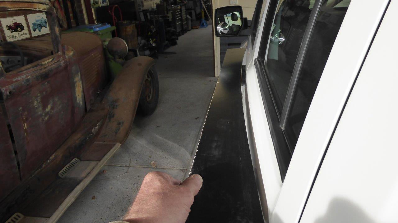 I made both a negative and positive sweep template, refining the curve using an adjustable body file set to the matching profile. I put the front of the template as close as I could to where the outside of the door profile will sit from the body. It looked like it has too much curvature for the extended body length I have now. Also the amount you see sticking out from the body shell is how much it will be covering the running board. I want more of the running board to show.