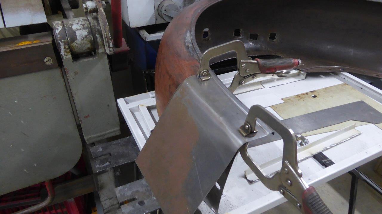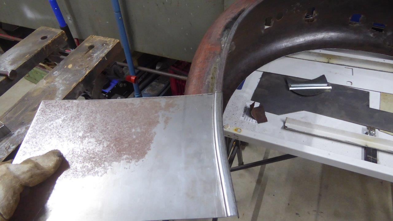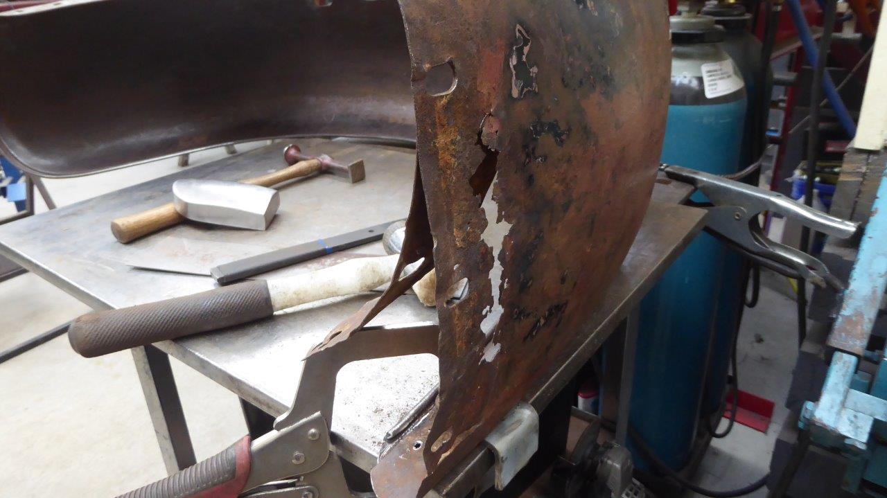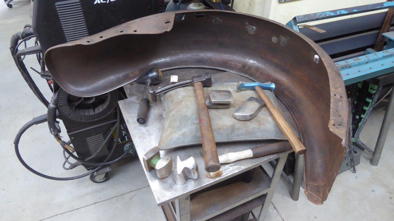 Before I can build the rear door, I need to know where the rear guard/fender is going to sit. To make sure it is as accurate as possible, any repairs and modifications need to take place to it first. It had gathered some damage in its 93 year life so far, including being a paddock basher and garden art for the last half of it. Here I am knocking out the main dents and creases using the hammers and dollies shown over the sand bag.