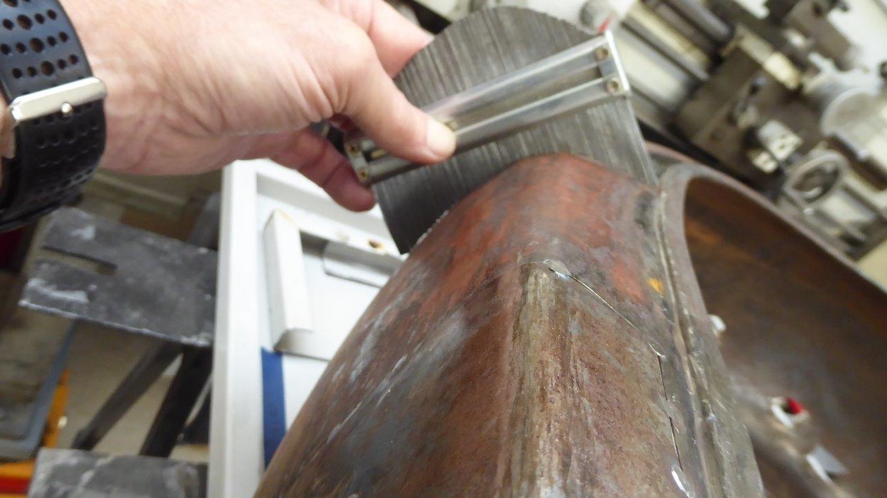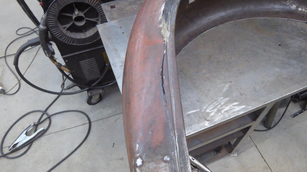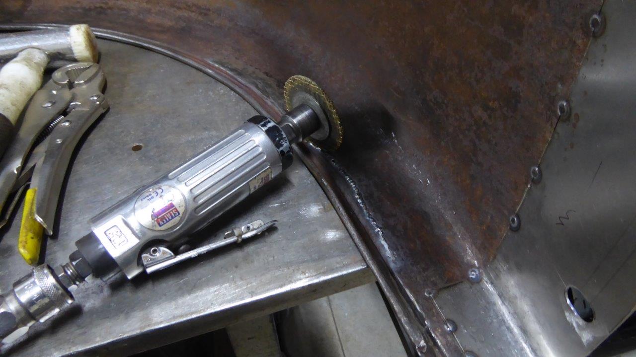 Once I was happy with the curve, or I couldn't get it to move anymore, I welded up the slot. This is the method I use to cut the top off the weld. A die grinder with what is left from a 9" cut off wheel! The disc was first used in my 9" grinder until it wore down to 5". It was then used in my 5" grinder until it was too small for that. Then it gets used in the die grinder until it is down to the support rings. The grinding is done at an angle to the weld only touching the weld surface, and not the original metal.