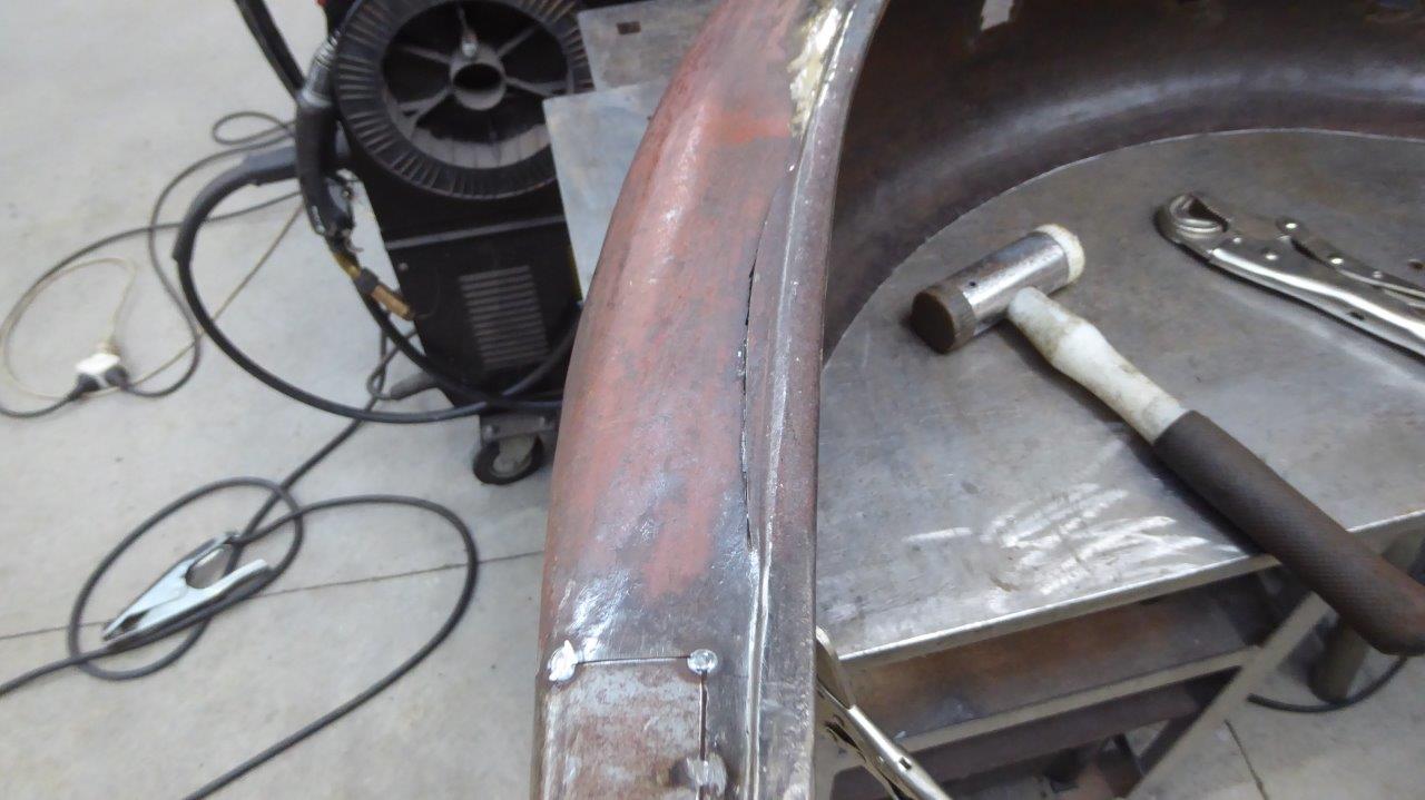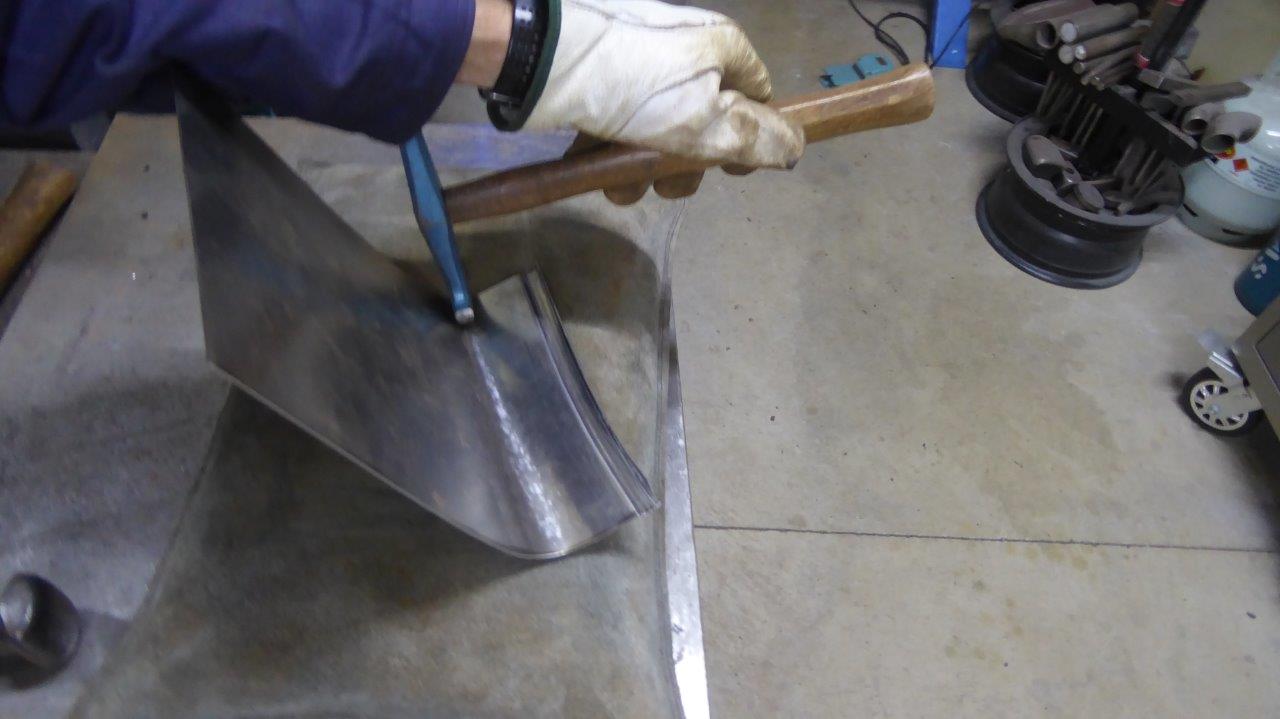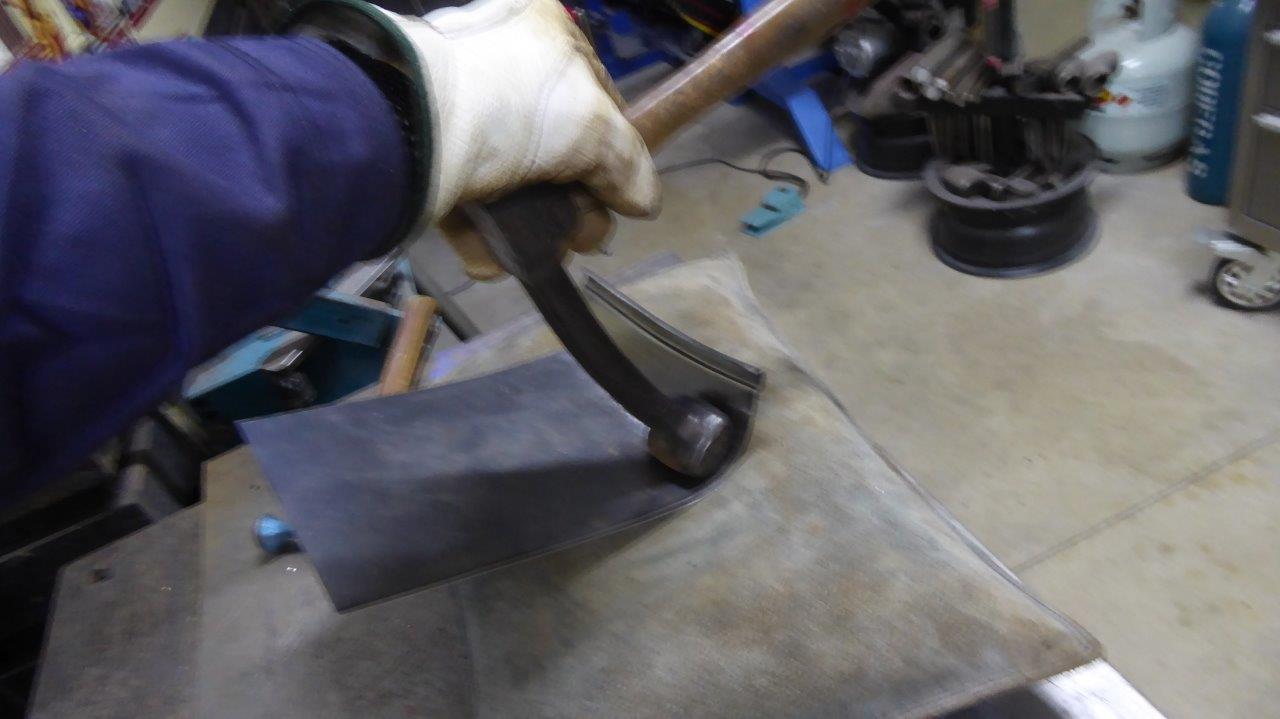 Over the sand bag I used this huge antique fender hammer to form the wide end of the radius.