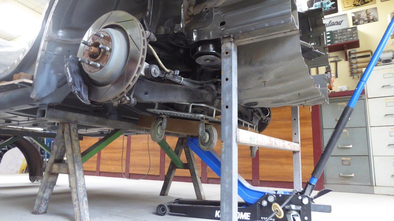 To make sure I had the exact centreline of the axle, I first put it back into place. Being on my own it would be awkward to first remove the assembly from the trolley it was on, and then get a jack perfectly balanced under it. So I put a piece of 8"x3" timber on the jack and rolled that under the trolley and jacked up the whole thing as one! Put the four bolts in and lowered the jack and trolley back down and the job was done.