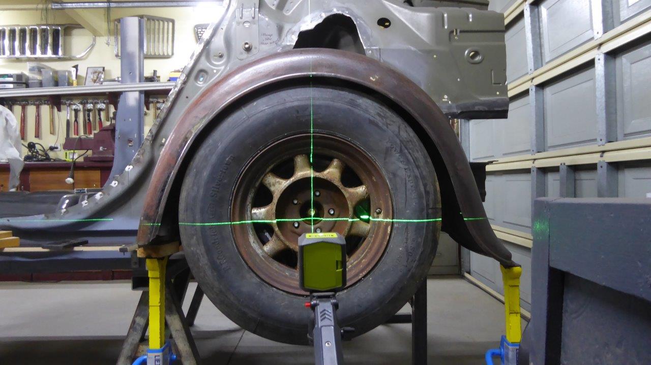 I used the laser making sure it was, not only exactly on the axle centre, but also square the the body as well. Otherwise on a multi-depth surface it will not read accurately at all. I placed the Willys guard in place and lifted it until it was at the same height as where the inner wheel well liner sits on the donor Chrysler. This will make sure I will have the same amount of up travel on the suspension without it hitting the guard. This places the guard 60mm-2 3/8" higher in the body than stock. So the whole wheel tub and arch in the Willys body will have to be lifted as well on the rear quarter panel.