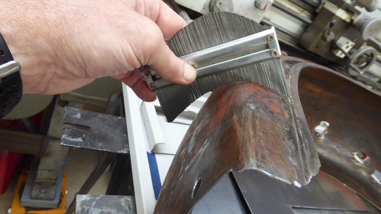 Next I would use a soft hammer to hit it across supporting the outside of the guard with my hand. If there was not enough curve yet, I would cut more away before repeating the exercise. The edge would twist, so it is important to twist it straight again using channel grips or pliers before moving on.